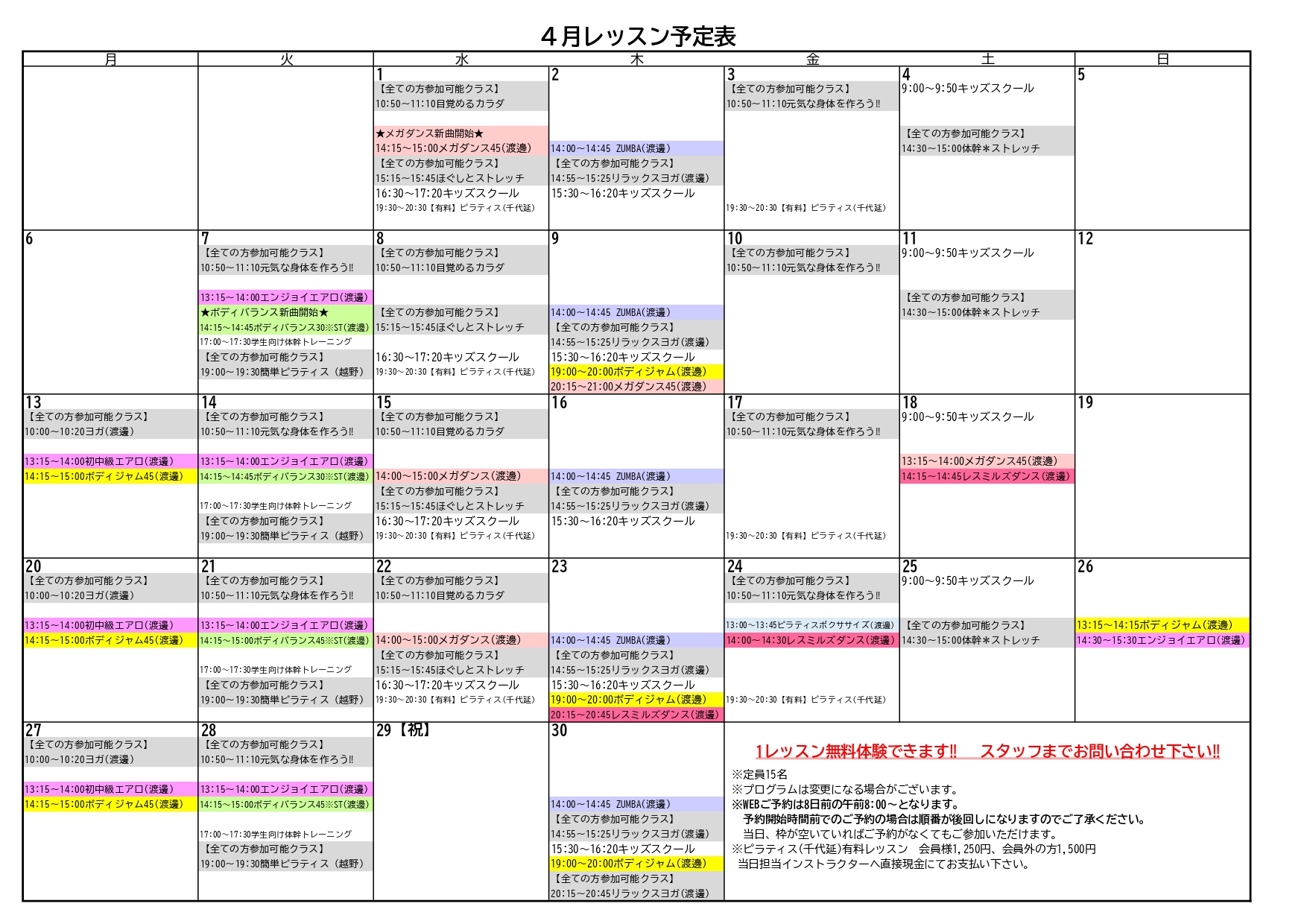 4月スタジオレッスン表